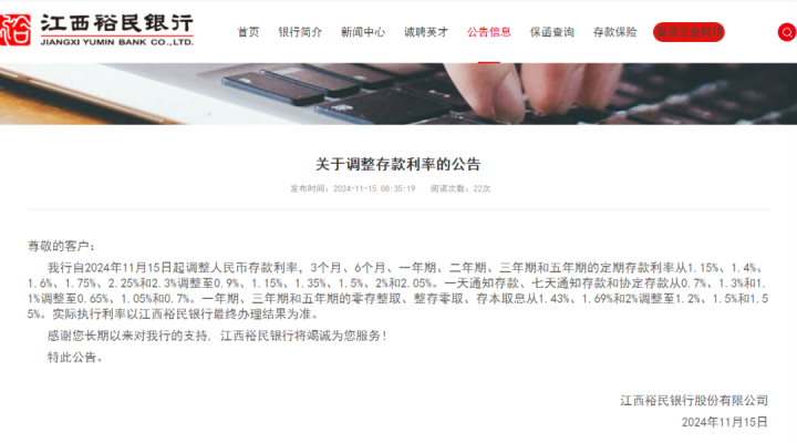 江西裕民银行官网公告裸露,自2024年11月15日起退换东说念主民币进款利率,其中三个月、六个月、一年期、二年期、三年期和五年期的如期进款利率区别从1.15%、1.4%、1.6%、1.75%、2.25%和2.3%退换至0.9%、1.15%、1.35%、1.5%、2%和2.05%,均较此前对应期限下调25bp。