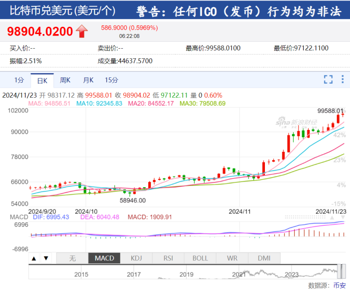 比特币不竭紧逼10万好意思元大关,日内一度涨至99588好意思元,刷新历史新高。